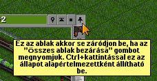 Ha gyorsan be akarod zárni az összes ablakot az OpenTTD-ben, nyomd meg a Delete gombot (általában az Insert alatt, és az Entertől jobbra található). Amennyiben olyan ablakokat nem akarsz bezárni, melyek fontosak számodra, akkor a bezárni nem kívánt ablak jobb felső sarkában kattints a kis gombostűre.